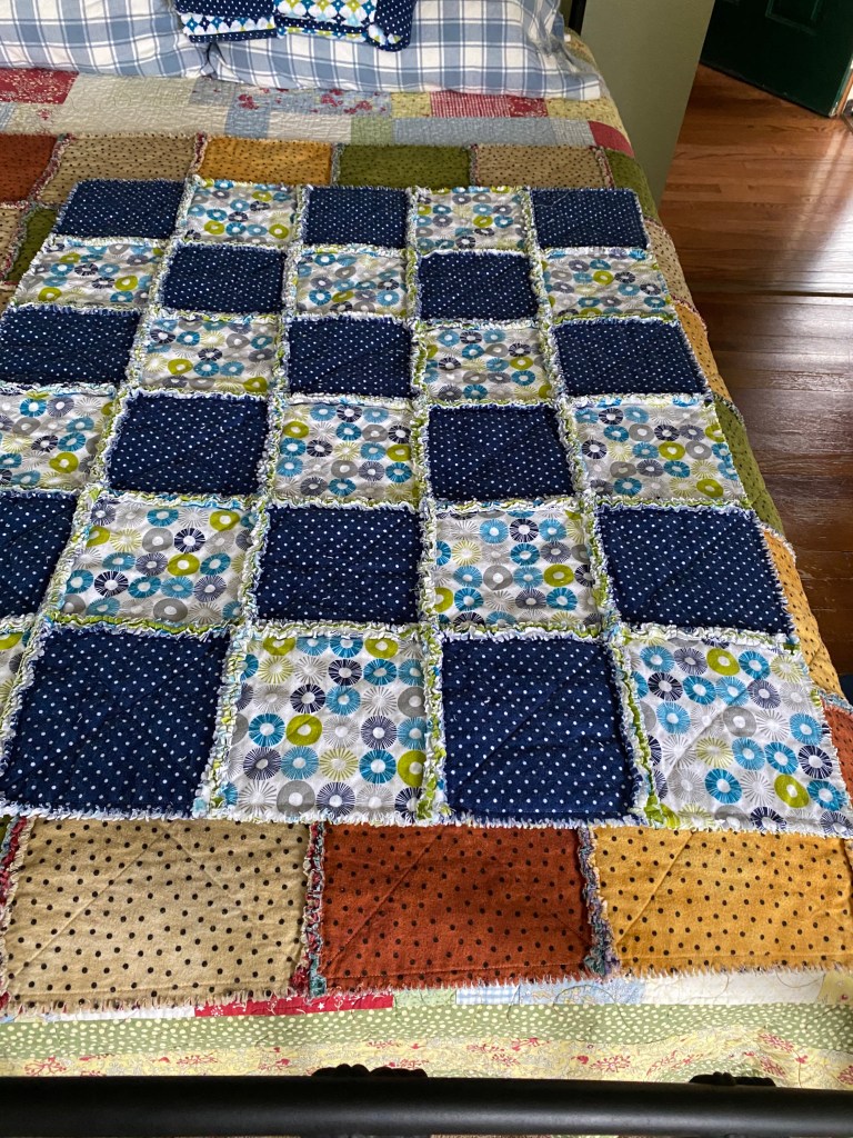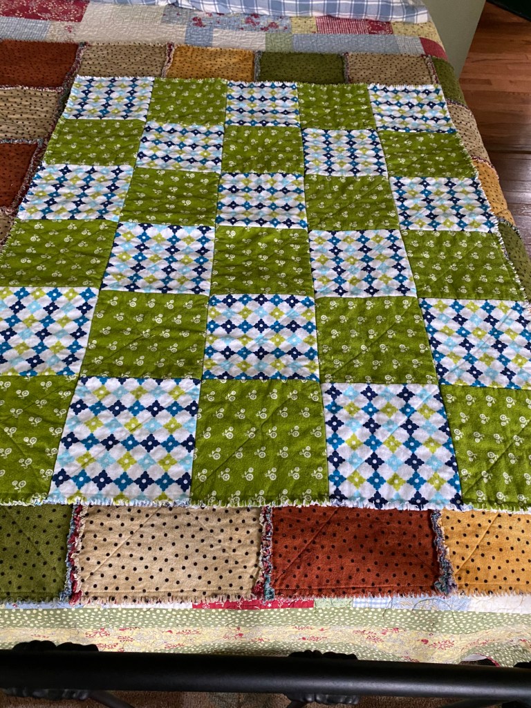 The Mrs. has been busy with her quilting lately. It seems the Young’ns keep reproducing. She whips out these Rag Quilts pretty quickly. Snipping the edges leaves threads throughout the house, easy tracking for the Indians.